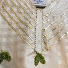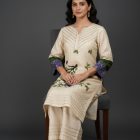 This beautiful two-piece suit is a work of art, crafted from luxurious Jamawar fabric with a subtle check pattern. The V-neck and trouser hems are decorated with gota Hand-embellished with zari tubes, beads, and dabka. A breathtaking hand-painted scene of lovebirds on a branch graces the front, while the sleeves are finished with elegant green cuffs featuring detailed embroidery. This unique ensemble seamlessly blends traditional techniques with modern design, making it a sophisticated and charming choice.