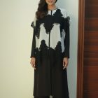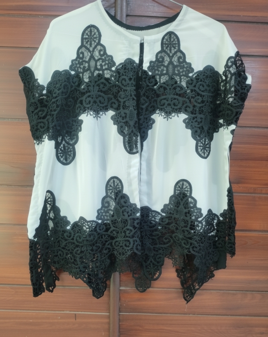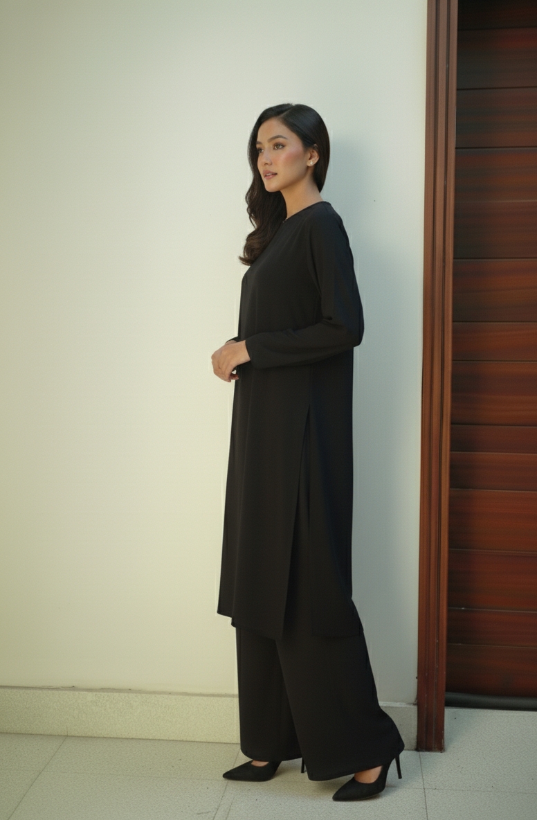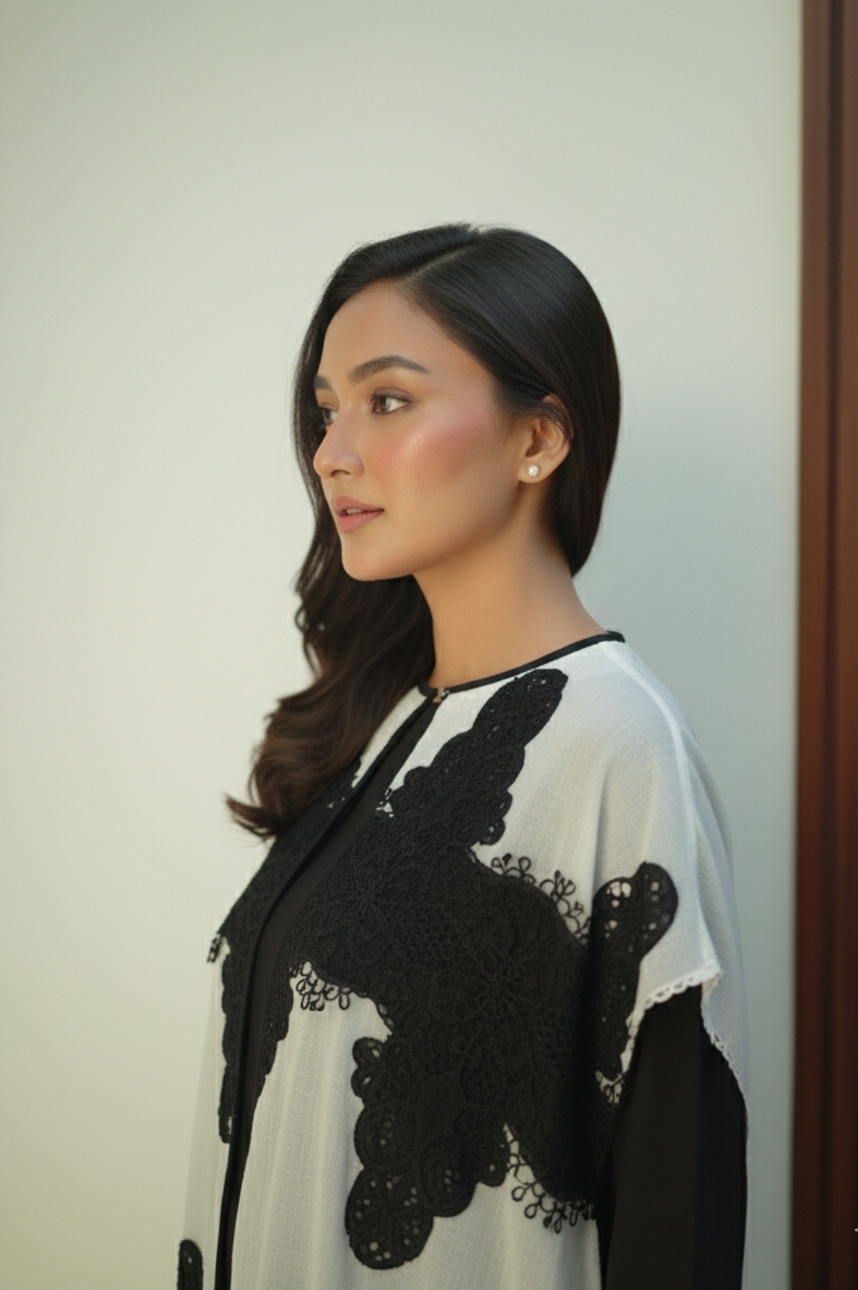 Elevate your modest attire with this striking Monochrome Tunic Set, a perfect fusion of classic contrast and modern structure. The statement tunic features an opulent Black Ornamental Lace appliqué, beautifully layered over a white body. This intricate, three-dimensional lace extends dramatically over the shoulders and down the open front. Full-length black sleeves provide a sleek, slimming contrast to the light central panel. Cut for a graceful, sophisticated drape, this piece moves beautifully as you walk. This versatile set is an ideal choice for special events, dinner parties, or any occasion.