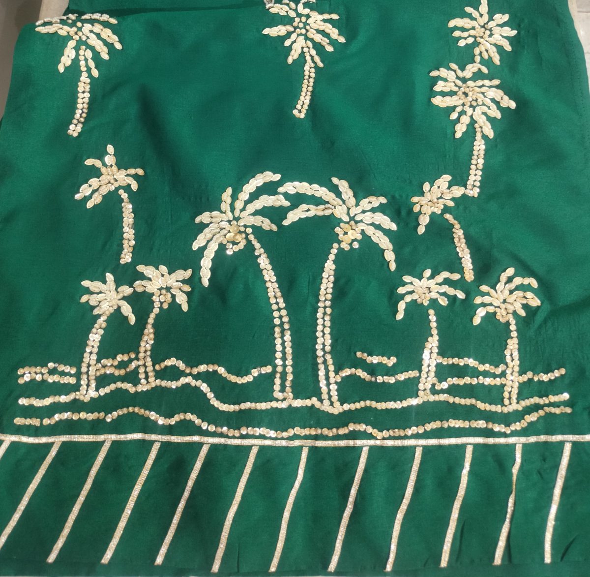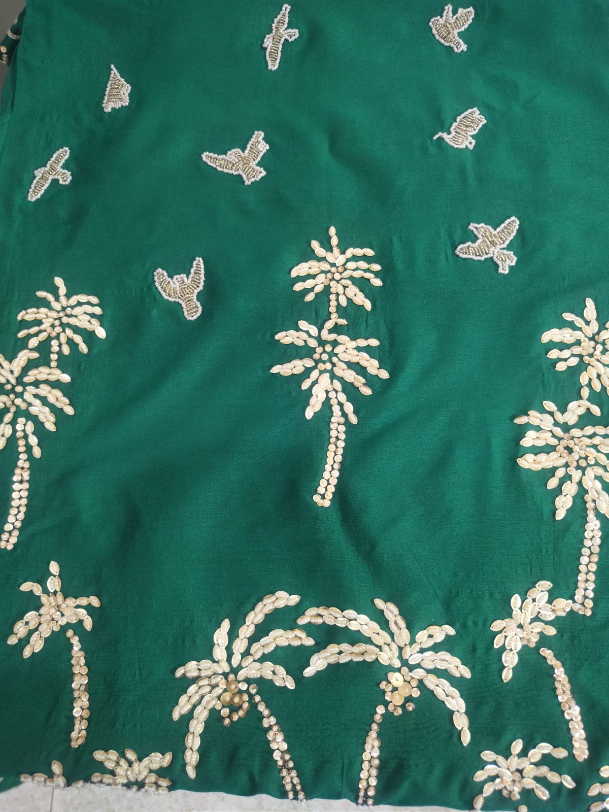 A vision of timeless grace — Emerald Whispers is crafted in luxurious blended silk, blending contemporary sophistication with classic Eastern charm. The flowing shirt and embroidered shawl mirror the serene beauty of palm motifs, while the pk raw silk trousers complete this refined silhouette. Every stitch tells a story of quiet confidence and effortless poise.