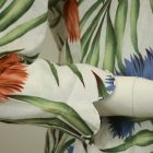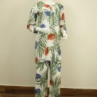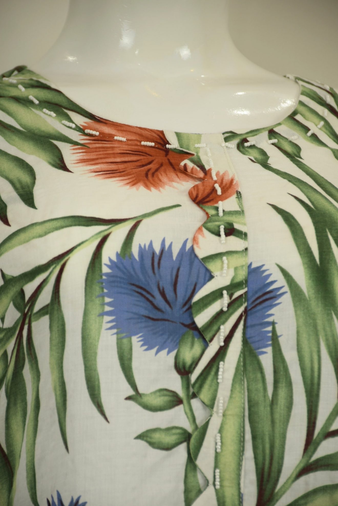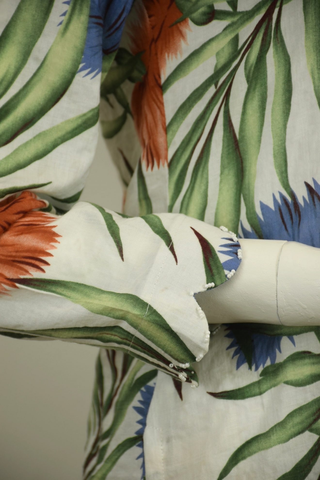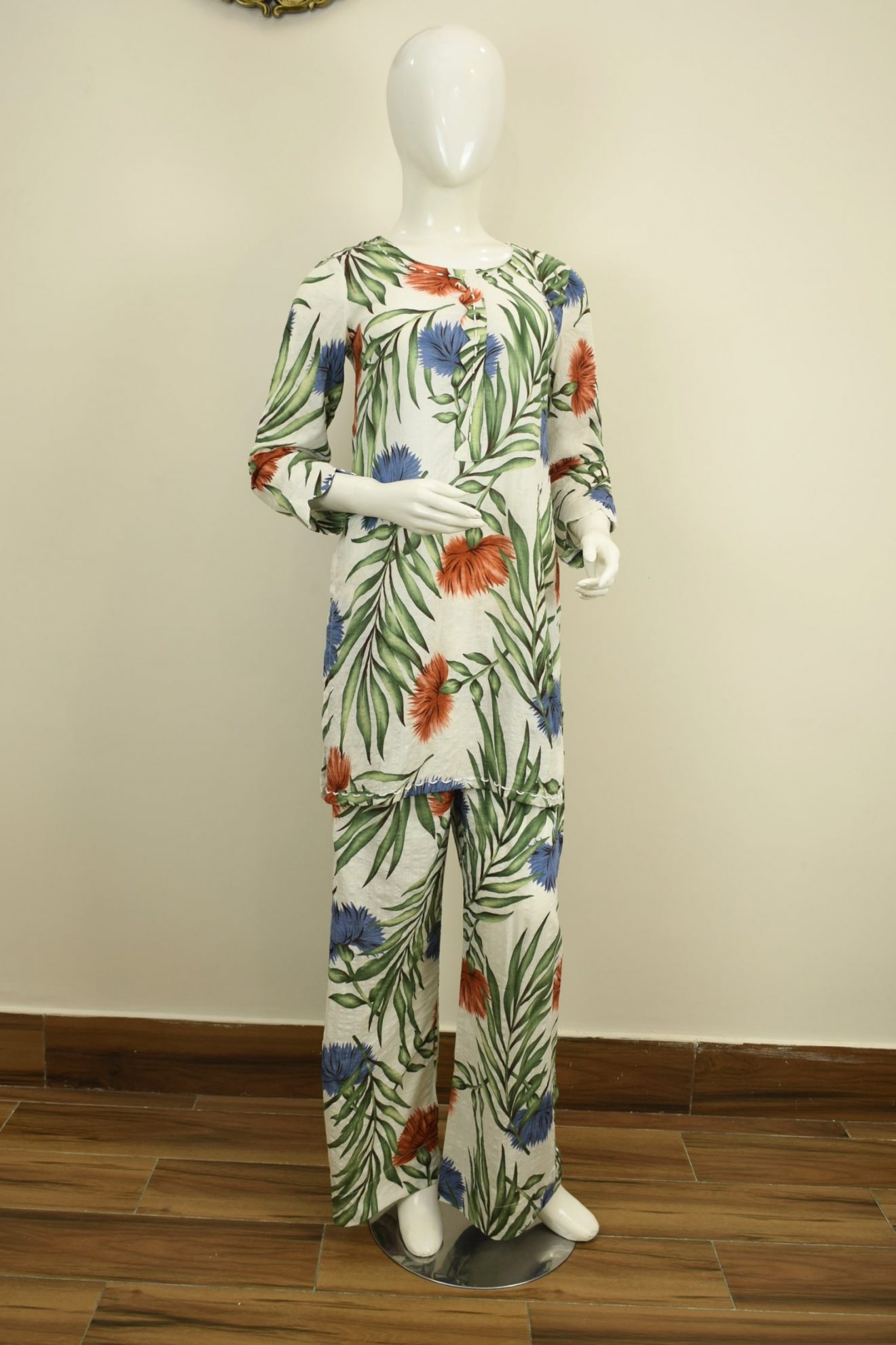 This white lawn coord 2-piece outfit with a vibrant floral pattern, featuring red and blue flowers and green leaves.having stylish neckline and sleeve hem decorated with white beads.