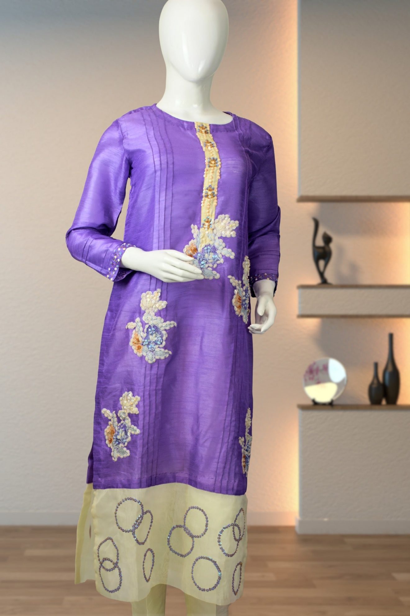 This dress is unique due to its high-quality, handcrafted details. It combines traditional raw silk with a modern organza patch, featuring intricate hand-embellished applique, sequins, and beadwork. The use of multiple techniques and the careful coordination of colors and patterns make it a standout piece, distinct from mass-produced designs.