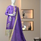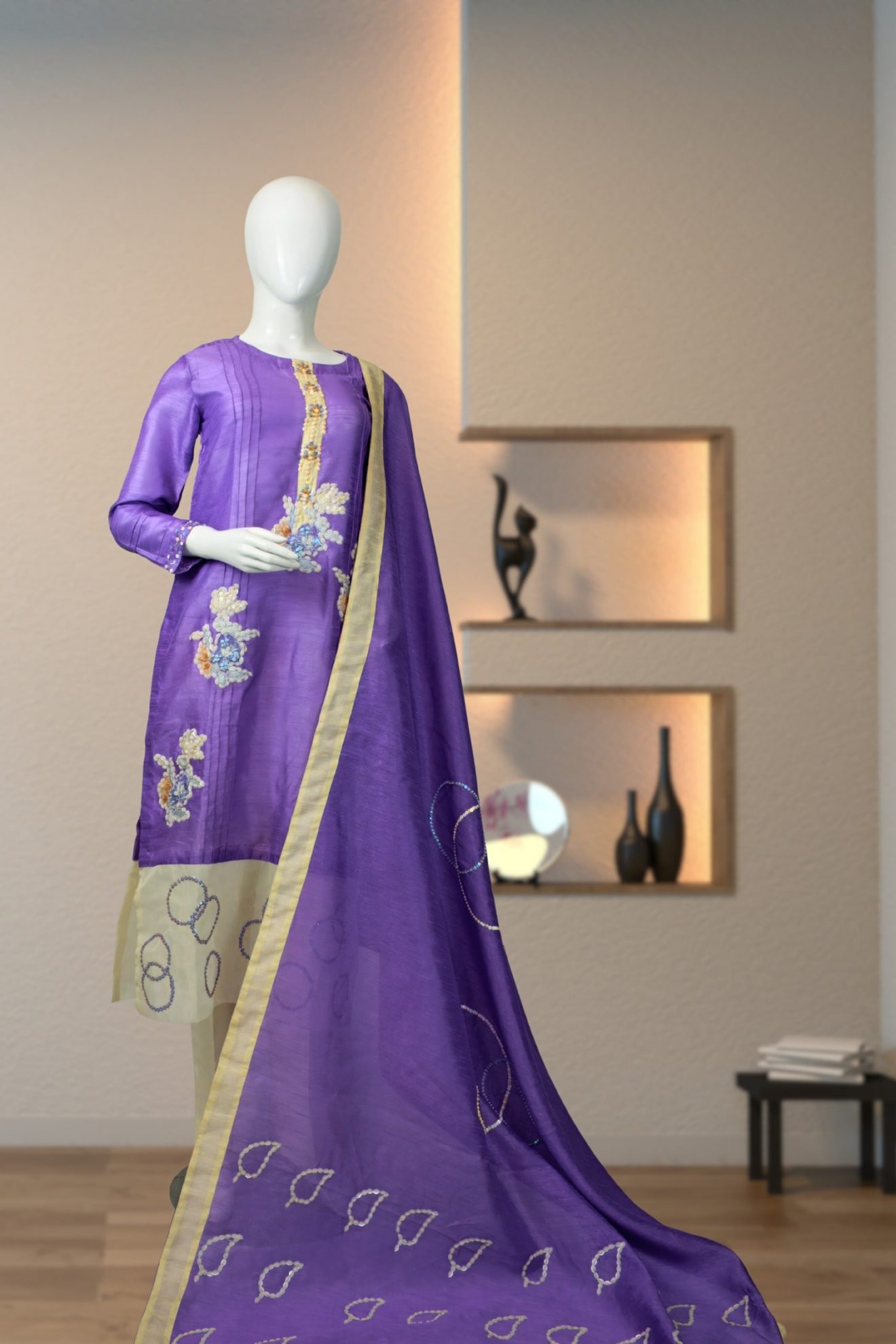 This is a beautiful three-piece suit featuring a shirt, trousers, and a shawl.