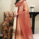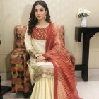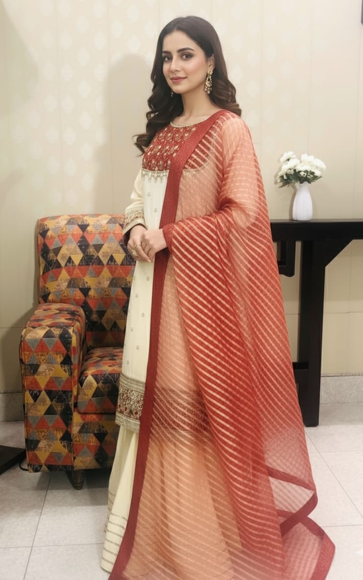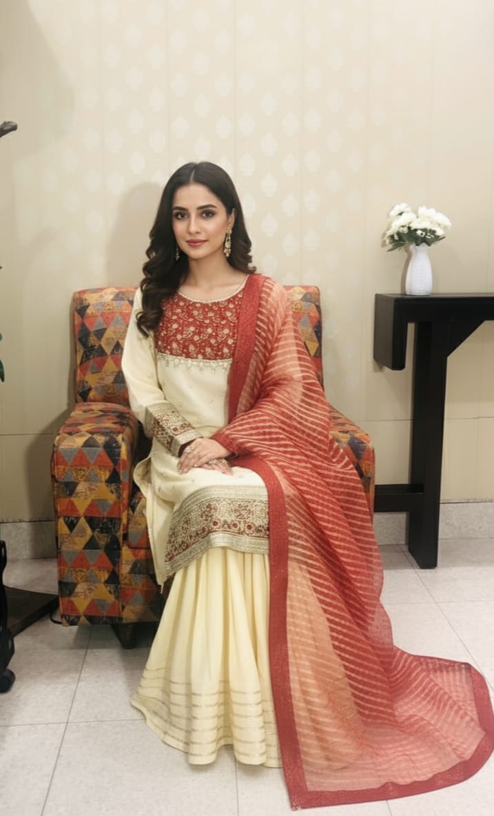 The shirt is made from soft Georgette Chiffon and features rich traditional work on the yoke and cuffs, including Marori Work, Gota, Dabka, Petals, Beads, and Sequins. It is paired with a wide-legged Raw Silk Sharara and a shimmering Zari Organza Dupatta, giving the ensemble a luxurious, festive drape.