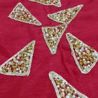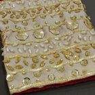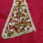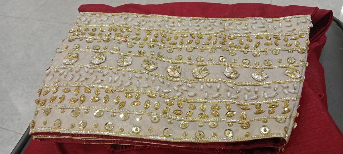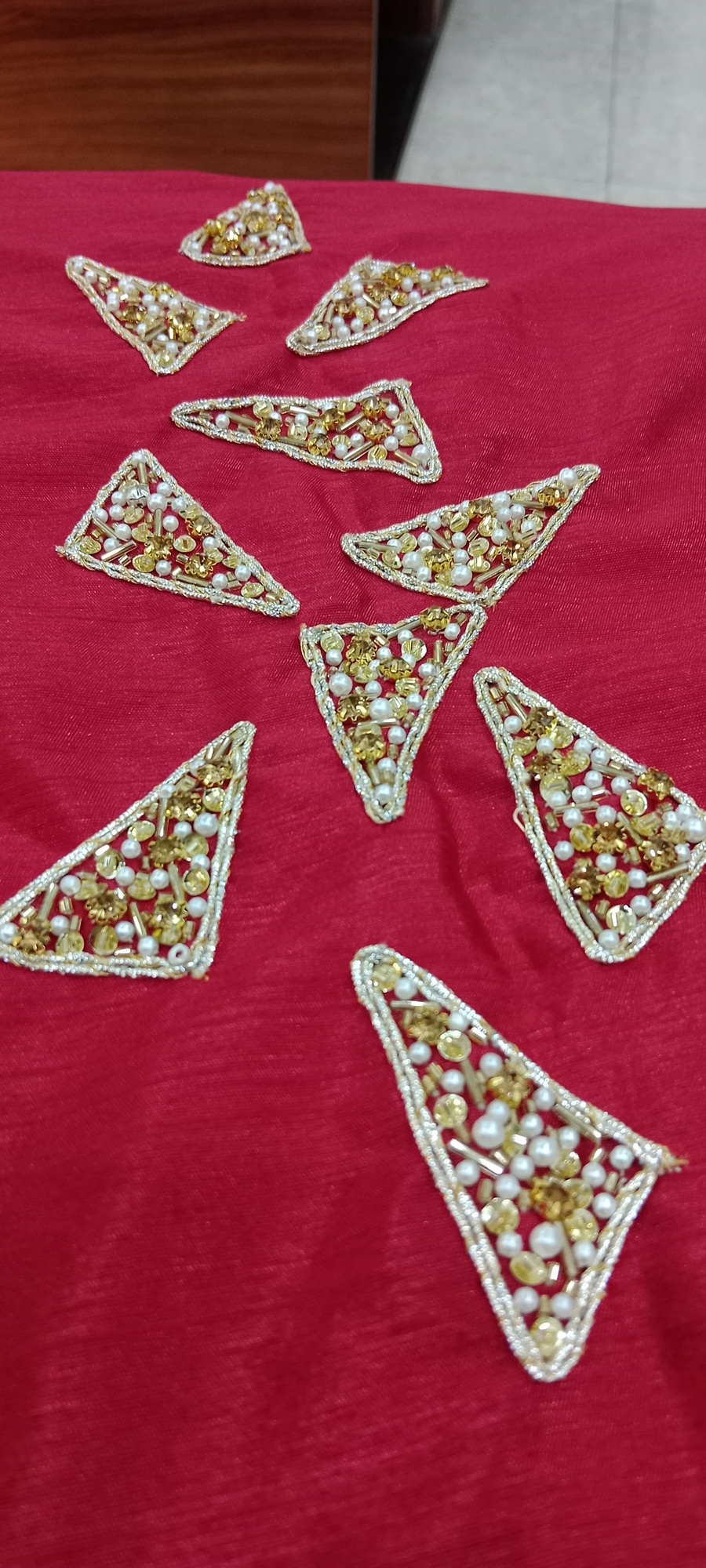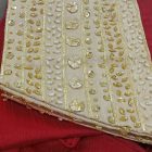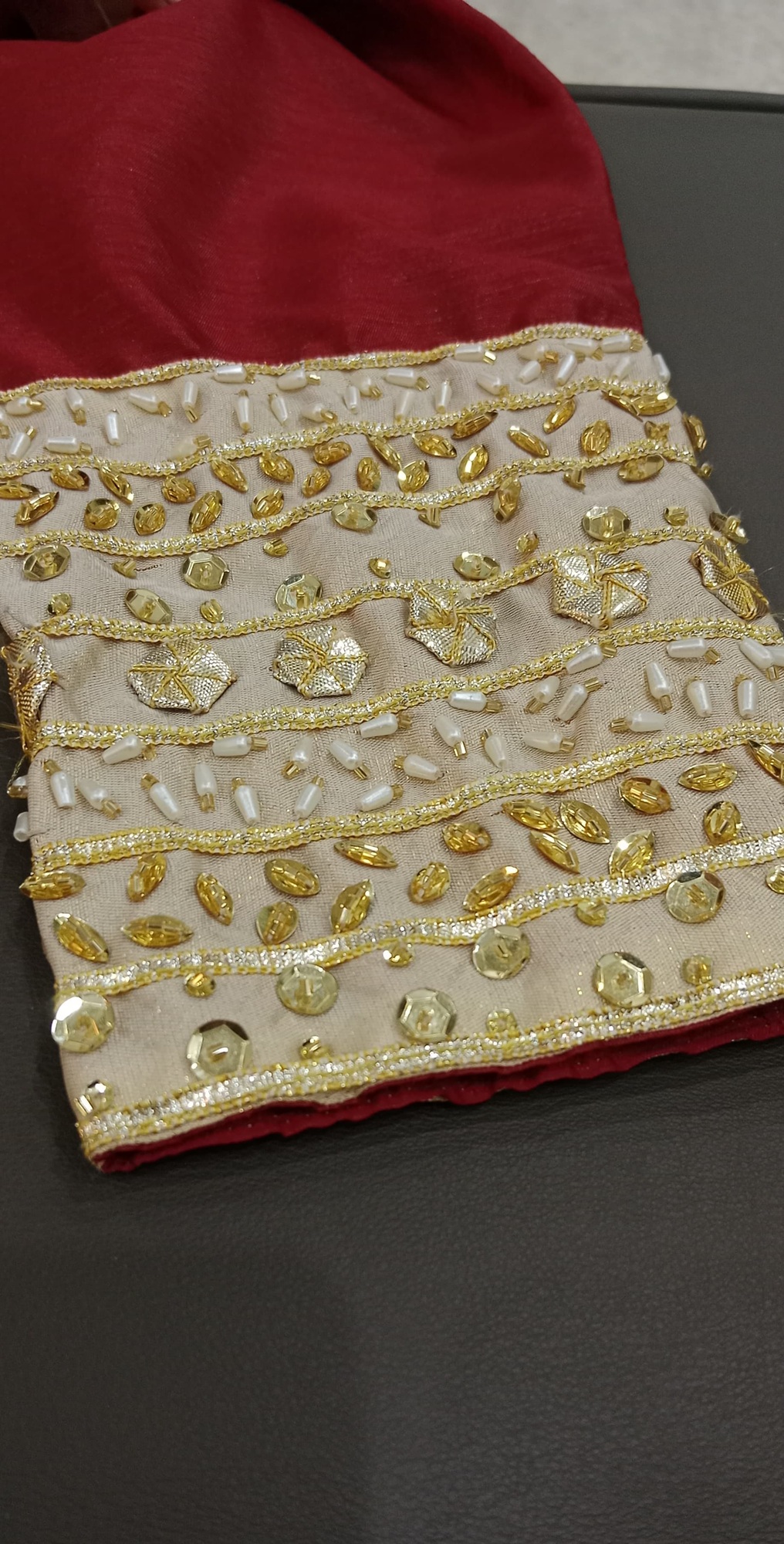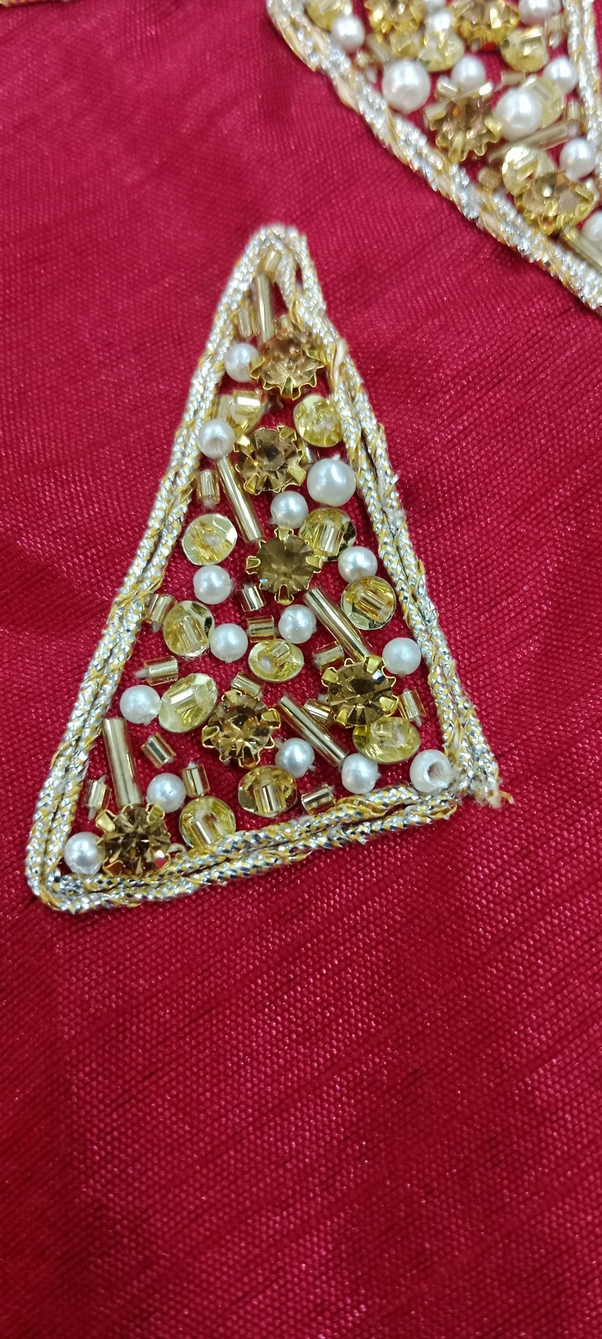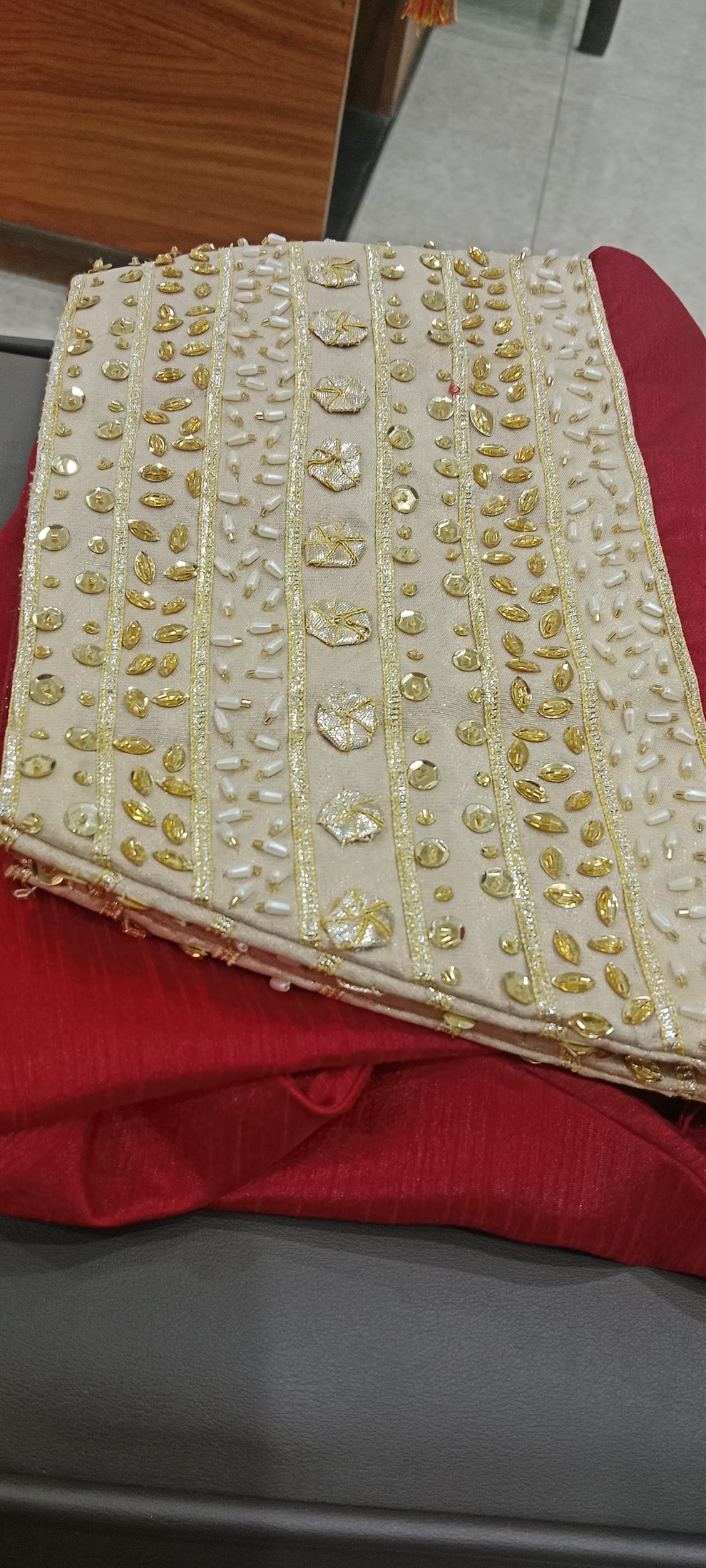A timeless celebration of heritage, the “Regal Ruby Gota Farshi Ensemble” is handcrafted on PK raw silk. The deep ruby shirt features intricate hand-embellished motifs made with gota tubes, pearls, stones, and beads, creating a striking geometric statement on the front. The sleeves and farshi shalwar are adorned with rich gota and detailed embellishment, adding royal grandeur to the silhouette.