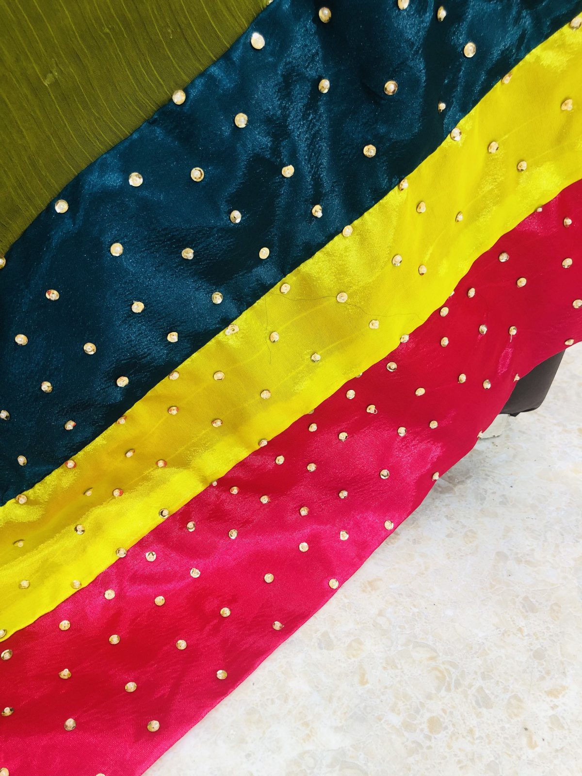 A vibrant, layered ensemble featuring a flared Georgette Chiffon frock and dupatta over a textured Jamawar lehenga. The frock is richly Hand Embellished and Hand Painted with beads, sequins, and mirror work. The lehenga is accented with traditional Chatta Patti color-blocked borders, making this set ideal for celebratory events.